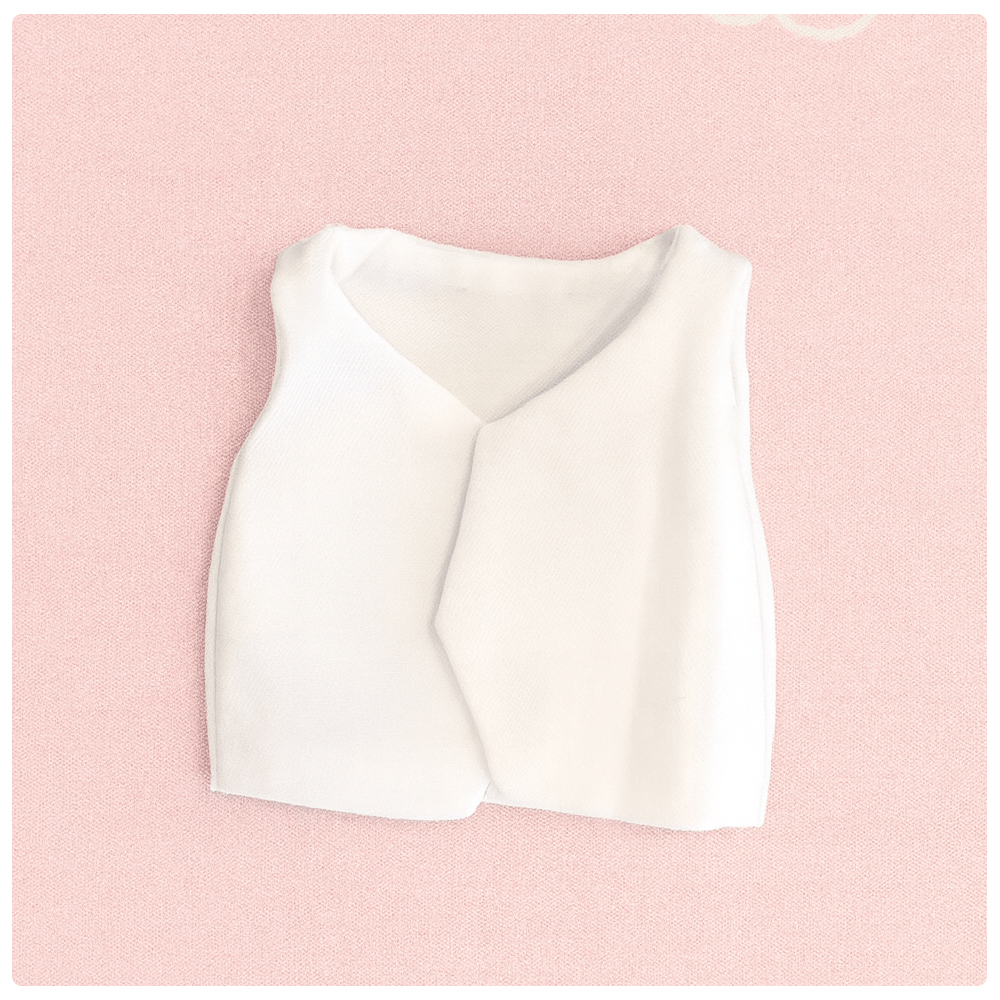 Este chaleco blanco, con su corte en pico y estilo abierto, es la prenda que le da a la Muñeca Compañera su personalidad distintiva, tal como aparece en el libro «Conociendo a Mamá». Es perfecto como recambio si el original necesita un descanso, o como un básico para combinar con otros pantalones y suéteres.